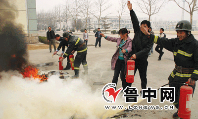 昨天上午,一场别开生面的消防技能比武在山东理工大学西校区举行,来自淄博市公安消防支队的两名消防队员和山东理工大学的十多名消防志愿者进行了比武。 消防队员和消防志愿者分成两队,先后进行了穿消防战斗服和灭火比赛。在灭火比赛中,由于消防队员所使用的灭火器已经过期,无法喷出干粉,结果消防志愿者不战而胜。针对这一情况,消防队员介绍说,干粉灭火器都是有使用期限的,平时应注意检查,过期的干粉灭火器容易延误灭火时机。
