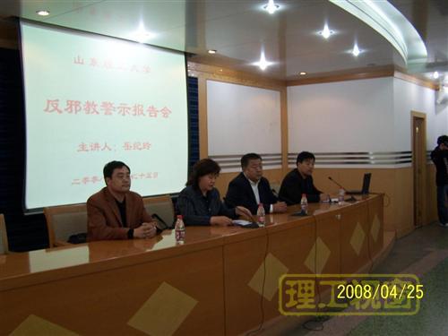 本站讯 4月25日下午,鸿远楼一楼报告厅座无虚席,我校100余名学生干部和保卫处全体职工,聆听了淄博市610办公室领导岳纪玲所作的反邪教警示教育报告。我校党委常委、副校长张元利,淄博市高校工作委员会有关领导出席报告会。保卫处负责人司继胜主持报告会。