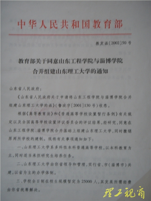 1、2001年3月29日,山东省委、省政府在淄博鲁中宾馆召开会议,宣布关于山东工程学院、淄博学院合并组建新大学的决定,成立两校合并联席会议及筹备小组。副省长邵桂芳出席会议并讲话,省委、省政府有关部门、淄博市委、市政府及市直有关部门的负责同志,山东工程学院、淄博学院领导班子成员参加了会议。经过一年多的筹备建设,2002年3月21日,教育部致函山东省人民政府,批准同意在原山东工程学院、淄博学院合并基础上组建山东理工大学。