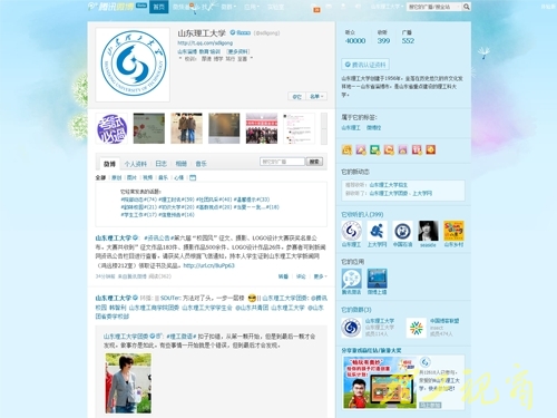 552条微博,40000名粉丝,12月22日下午,由山东理工大学新闻网维护的山东理工大学腾讯微博在开通585天后粉丝数突破四万人大关。这也标志着腾讯微博已成为山东理工大学新闻网与师生互动、对外宣传的有力媒介。