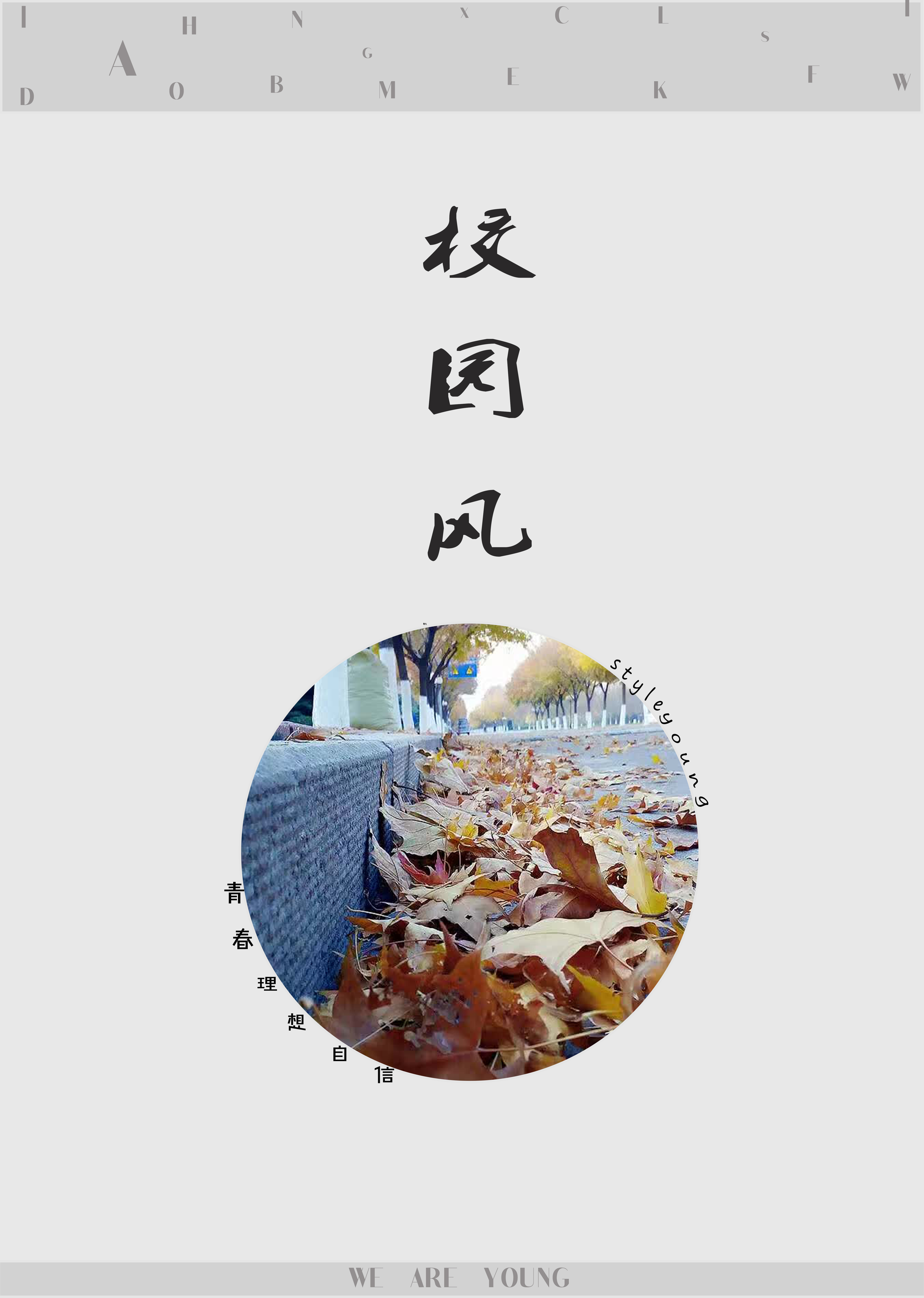首先,我的设计思想是将校园元素和流行元素结合,凸显出校园的活力和激情,并且让我们在体验校园风格同时还有一种舒适自然的感觉。我的灵感都是来源于校园中的风景,我在校园里行走的时候看见美丽的落叶铺满地,就想可以让他在一个镜头大小的圆中表现出来,因此我设计在海报中。其次关于颜色搭配,舒适的灰色使人们视觉效果更舒适,中间的圆的颜色又让我们有一种视觉冲击,注意力集中在中间。同时海报上下的字母就是流行元素的体现,在小清新中体现一股原宿风,自然舒适。