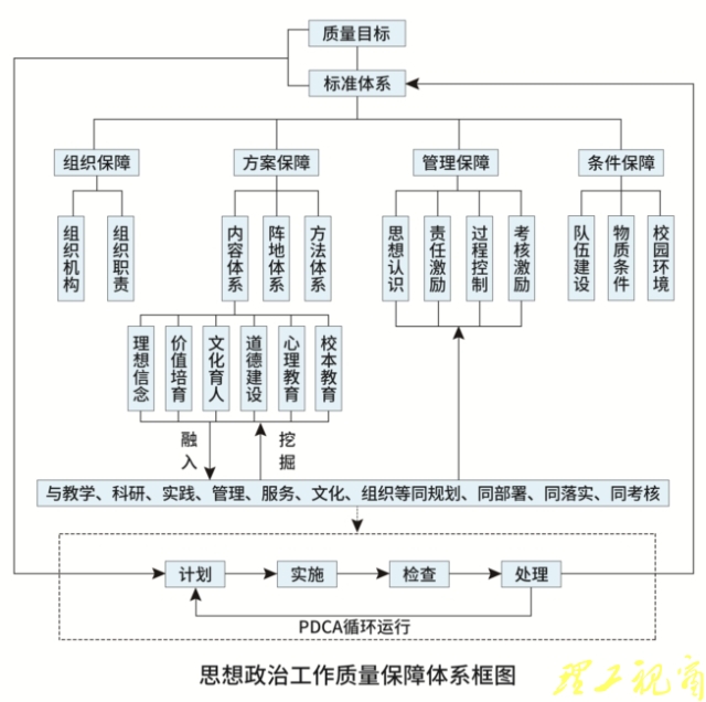学校思想政治工作是一项涉及面广、需要全校上下合力推进的重大的政治任务和战略工程。运用全面质量管理的思想构筑学校思想政治工作质量保障体系,是全面贯彻落实全国全省高校思想政治工作会议精神,深入实施《中共山东理工大学委员会 山东理工大学关于加强和改进新形势下思想政治工作的实施方案》,推动落实全员全过程全方位育人,使思想政治工作落到实处、取得实效的重要保障,也是一项重大创新性举措。构建思想政治工作质量保障体系,能够进一步明确学校思想政治工作的目标任务、工作标准,厘清职责定位,推动工作创新,确保各种资源和要素围绕思想政治工作发挥积极作用,保障思想政治工作的有效开展,预防产生不良结果。通过思想政治工作质量保障体系按PDCA循环科学运转,做到大环(上级循环)套小环(下级循环)、一环(前期循环)扣一环(后期循环),实现思想政治工作质量的螺旋式上升。