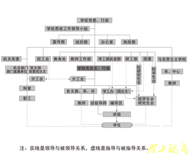 学校党委全面领导学校思想政治工作,切实发挥领导核心作用,党委书记履行学校思想政治工作第一责任人的职责。按照“党政同责”原则,校长对学校思想政治工作负重要责任。分管思想政治工作的校党委副书记是直接责任人,协助党委书记、校长抓好思想政治工作的统筹协调落实工作。其他班子成员履行“一岗双责”,结合业务分工抓好分管领域思想政治工作。学校思想政治工作领导小组具体组织领导、推动落实全校思想政治工作。