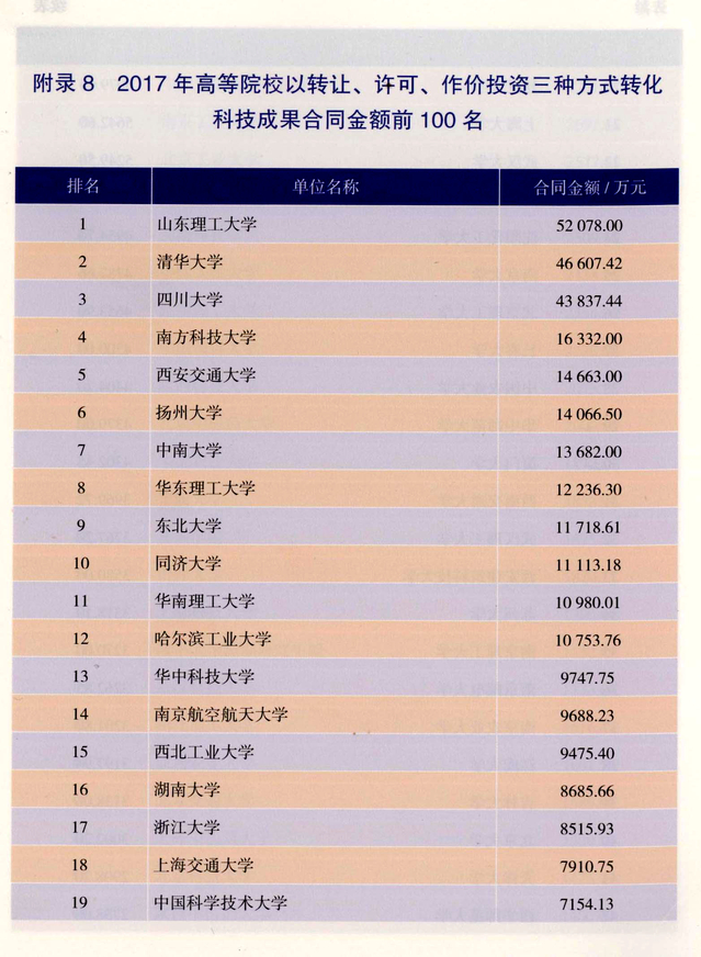 2017年高等院校以转让、许可、作价投资三种方式转化科技成果合同金额前100名