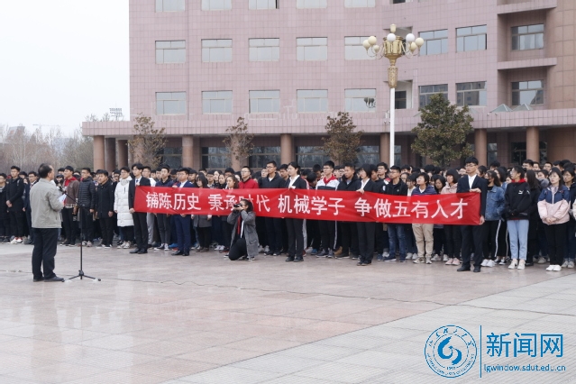 本网讯 3月18日,机械工程学院在鸿远楼广场举行以“弘扬时代精神,勇担历史使命”为主题的升旗仪式,学院党总支副书记、团总支书记、学生办公室辅导员及2018级学生参加升旗仪式。