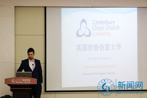 本网讯 4月2日下午,管理学院在学院报告厅举行国际交流活动。此次活动特邀英国坎特伯雷大学海外事务总监詹姆斯先生主讲,留学中心主管、学院相关负责人及部分学生参加。