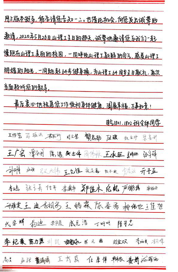 吕传毅书记的回信在电气1801、1802班全体学生中引起热议。同学们纷纷表示,“我们定会勤勉治学,不负韶华,增强体魄,共度时艰,彰显青年人应有的朝气与风貌,做优秀山理工人。今日如此,日日皆然,请您放心!”“一代人有一代人的长征,一代人有一代人的担当,我们定会在奋斗中担当起民族复兴大任!也很期待在学校64岁生日当天与吕书记共同漫步于校园!”