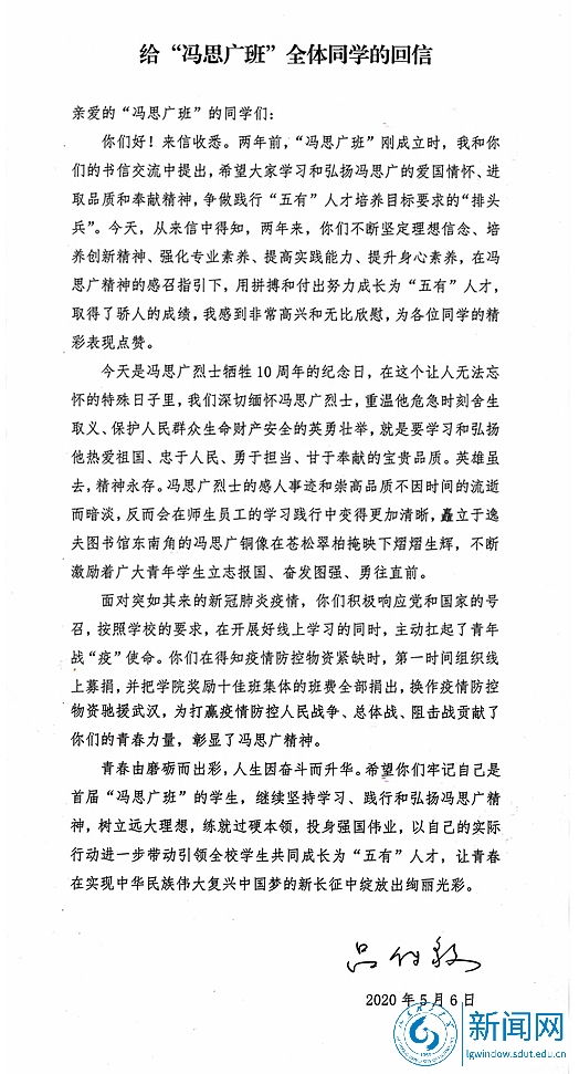 收到全体同学的来信后,吕传毅于5月6日给“冯思广班”回信,对于两年来在冯思广精神的感召指引下,“冯思广班”用拼搏和付出努力成长为“五有”人才并取得了骄人的成绩,感到非常高兴和无比欣慰,为每位同学的精彩表现点赞。