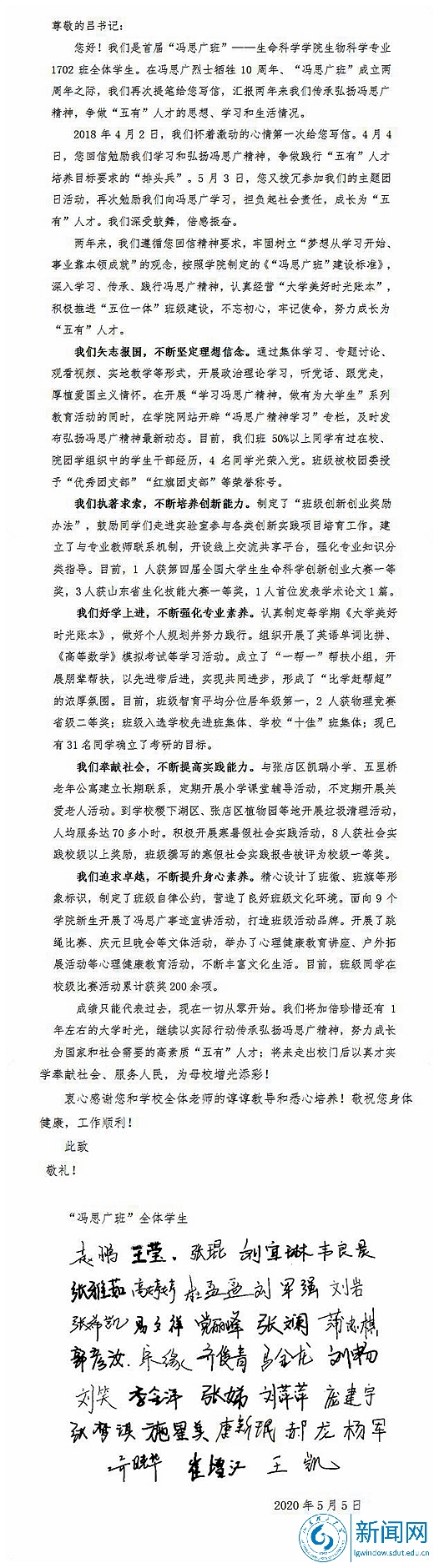 本网讯 5月5日,在冯思广烈士牺牲10周年、“冯思广班”成立两周年之际,我校“冯思广班”通过信件的形式,向党委书记吕传毅汇报了两年来“冯思广班”传承弘扬冯思广精神,争做“五有”人才的思想、学习和生活情况。