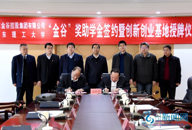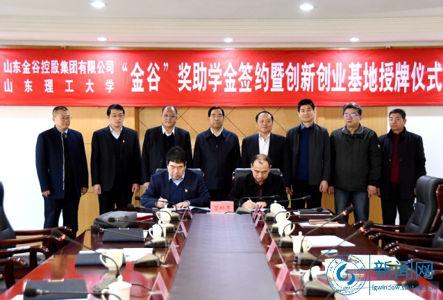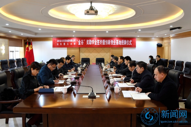 本网讯 12月8日上午,“金谷”奖助学金签约暨创新创业实践基地授牌仪式在鸿远楼九楼会议室举行。党委书记吕传毅,山东金谷控股集团有限公司董事长孙夫宝、总经理孙利、副总经理于晓兵出席仪式,集团董事会顾问、董事长助理、人力资源部负责人、高层次人才代表,我校党委(校长)办公室、学生工作处、校友联谊办公室、创新创业学院相关负责人,资源与环境工程学院党政领导班子成员参加仪式。