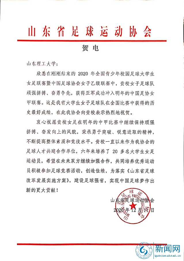 吕传毅、胡兴禹在贺信中说,欣闻你们在刚刚结束的2020年中国足球协会女子乙级联赛中,勇夺亚军并冲甲成功,创造了山东省大学生女子足球队在全国比赛中历史最好成绩,展现了我校“五有”学子良好的精神面貌,也展现了教练员们的运筹风采。你们在绿茵场上为学校争了光,为山东添了彩,我们代表全校4万多名师生员工向你们表示热烈祝贺!
